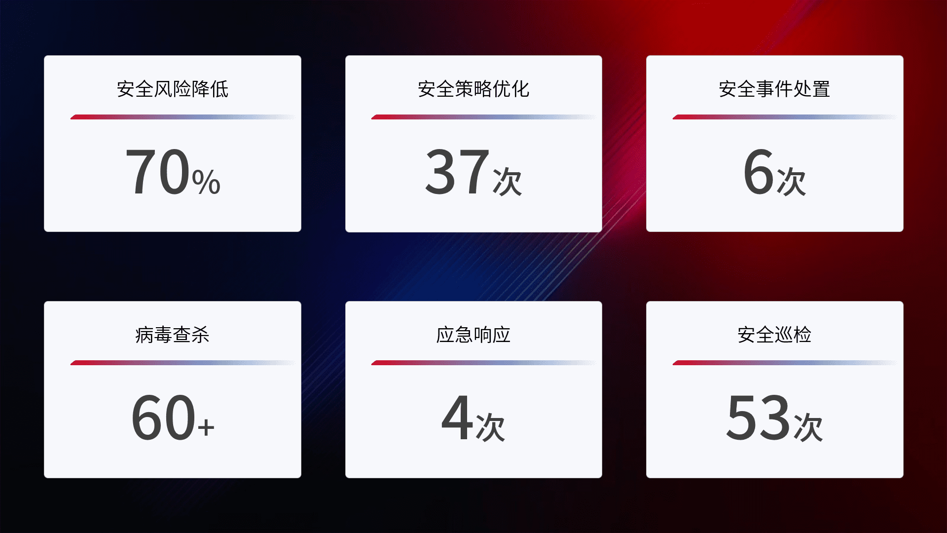 提供全面的安全事件报告体系,,,,包括处置报告、、周报、、、、季度和年度总结,,,结合持续监控,,帮助客户深入了解网络安全状况。。。