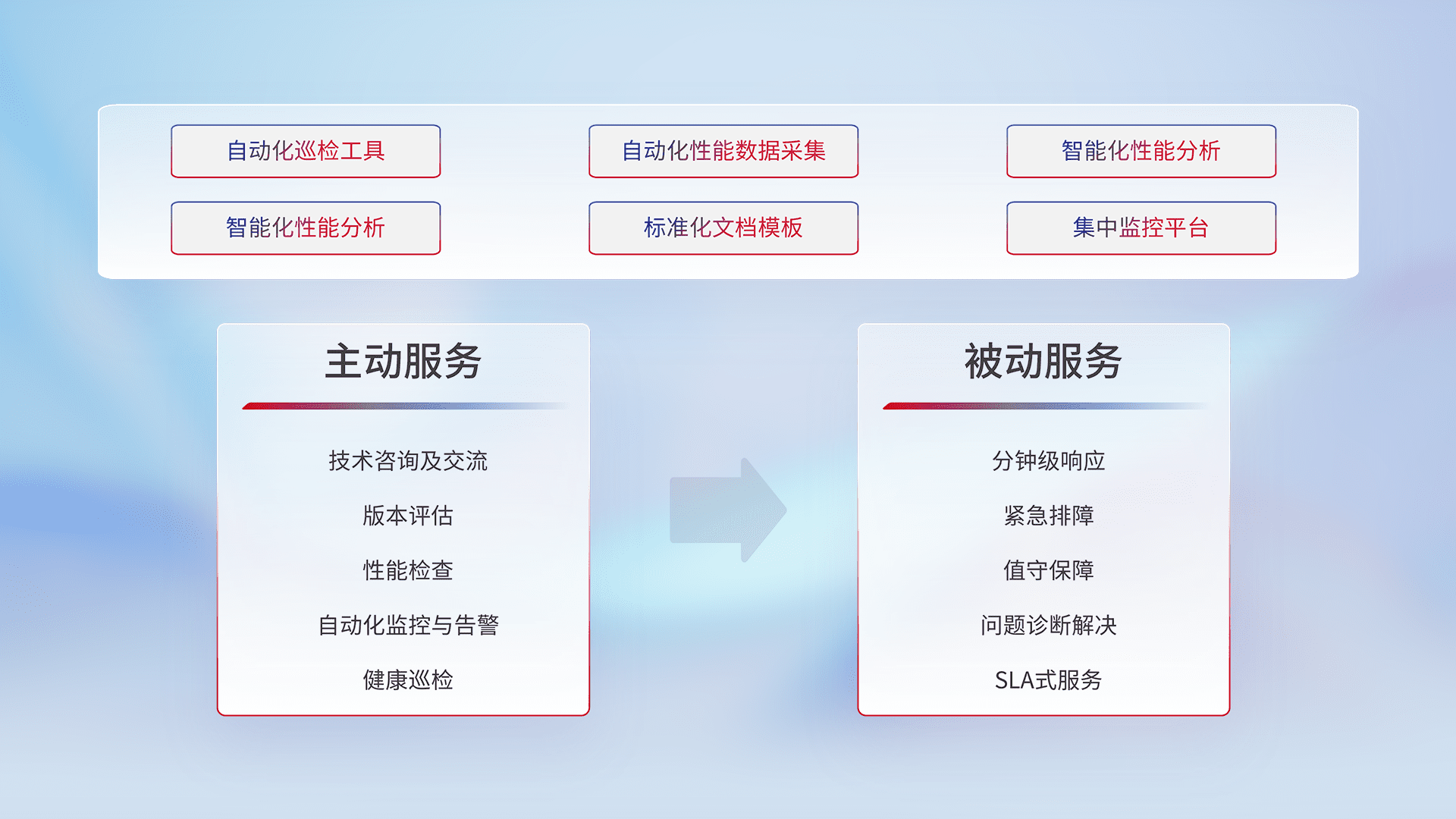 智能化工具和标准化文档,,,,保障服务质量,,,,提供主动服务(包含技术咨询、、、版本评估、、、性能检查、、、自动化监控与告警、、、、健康巡检)和被动服务包含(分钟级响应、、紧急排障、、值守保障、、、、问题诊断解决、、SLA服务)。。