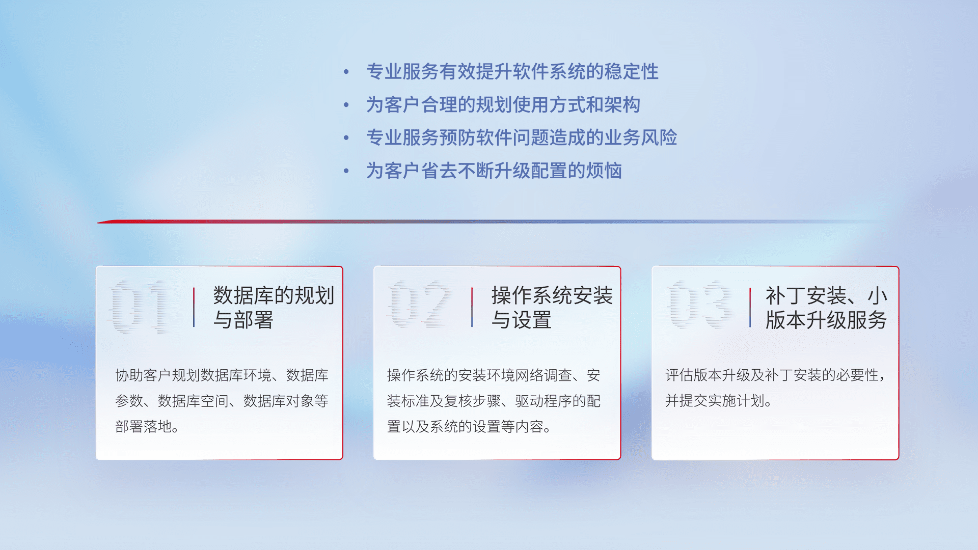 为客户提供软件规模升级、、快速部署、、、按需配置的专业服务,,,,从数据库的规划与部署到操作系统的安装与设置,,,,再到补丁安装和小版本升级提供支持。。